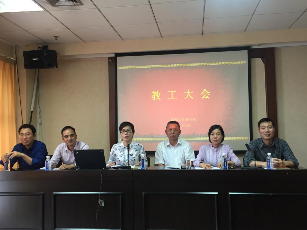 2019年5月29日下午,商学院在信息楼A301室召开了教工大会,会议由商学院党总支书记郑彩莲主持,全院教职工出席了会议。