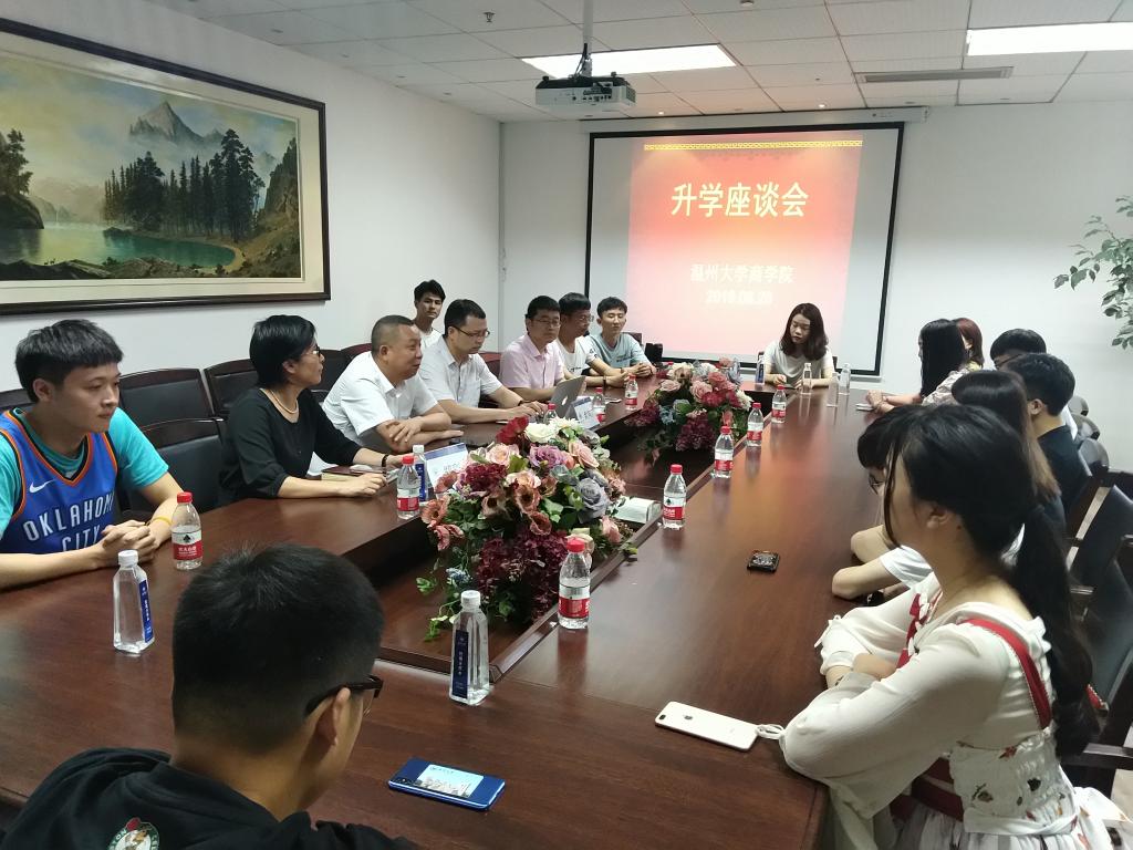 2019年6月20日下午,商学院考研留学优秀毕业生座谈会在信息楼A222会议室举行。院长胡振华、院党委书记郑彩莲、副院长余向前以及2019届考研留学的优秀毕业生参加了此次会议。