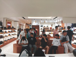 实体店里,康奈集团的产品琳琅满目,有皮鞋,皮包,还有各种衣服的等等。我们国贸班的同学都在认真的观看着实体店里的每一样物品,也都积极地向店里的导购小姐姐们询问相关的情况。