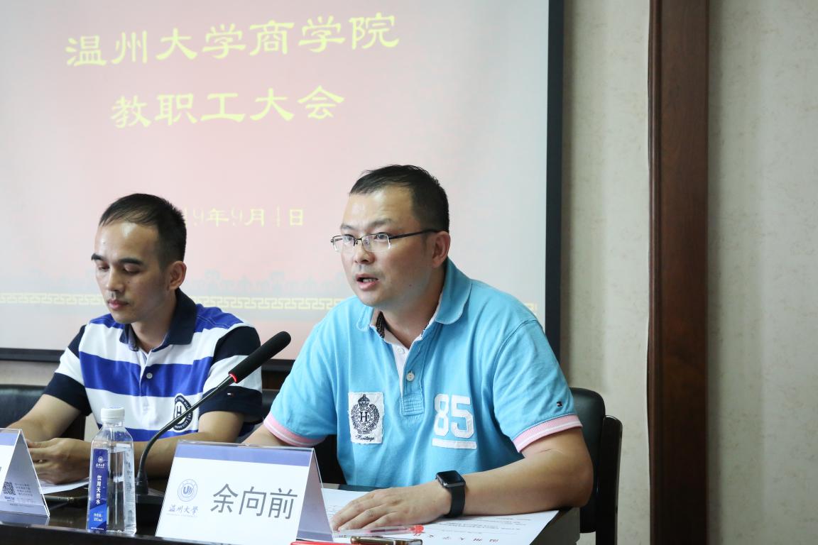 在新学期开学和第35个教师节来临之际,2019年9月4日下午在商院楼A301会议室召开了商学院教职工大会,联系商学院的校领导温州大学党委庄兴忠副书记应邀出席会议,学院领导班子全体成员及全体教职工参加会议,会议由学院书记郑彩莲主持。