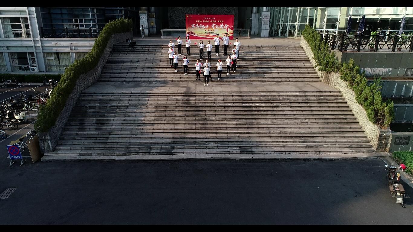 首先,在学生会的协助下,各位党员了解了拍摄主题视频的走位情况。接着,党员们手持着小红旗以及印有“建国七十年 奋进新时代” “我爱你中国”“不忘初心 牢记使命”等字样的宣传牌,由三位女生从商院楼里走出来,四位女生从“不忘初心,牢记使命”主题教育的宣传牌前走出来,再由三位男生从宣传牌另一侧走出来,剩下的党员则在台阶上斜着站成一排,大家开始齐声歌唱《我和我的祖国》。最后,全体党员围成一个爱心的形状,手中挥舞着小红旗,热情澎湃地唱着献给祖国的赞歌。
