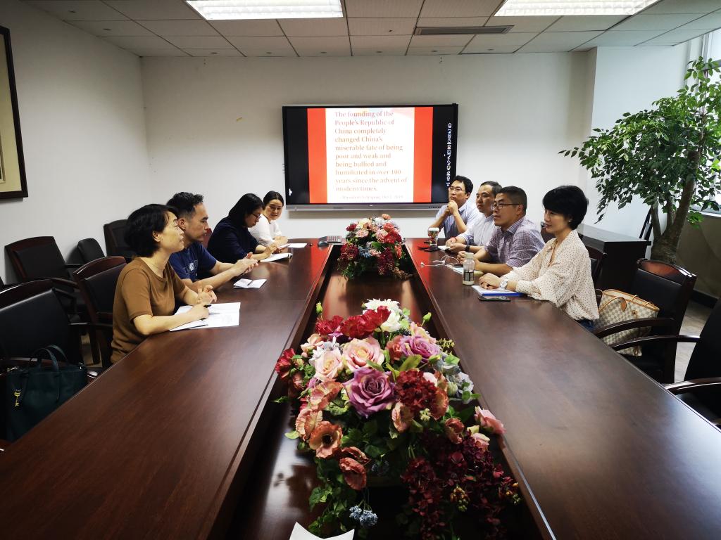 第一部分的参加对象是国际教学部的全体教师(包括党员和非党员教师)。大家首先重新聆听了习近平总书记在国庆大会上的讲话。为了体现国教支部的特色,教师们在聆听讲话之后,对照讲话的英语版,逐字逐句阅读翻译,深刻领会其中蕴含的精神。这一讲话深深激发了各位老师的国家和民族自豪感,大家都表示身为中国人的自豪感。这一讲话既回顾了历史,赞颂了中国过去七十年的发展,又展望了未来,提出了中国后续发展的保障和目标。各位老师纷纷表示,要爱岗敬业,要仅仅围绕教学和科研的岗位核心职能,做好本职工作,当优秀的人民教师。