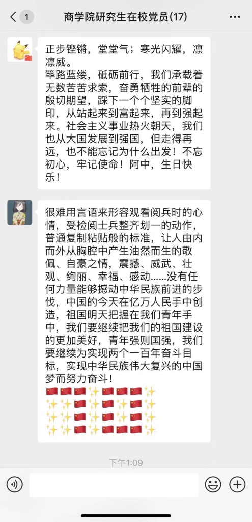 为深入学习“不忘初心、牢记使命”主题教育,认真贯彻中央主题教育精神。商学院研究生党支部于10月1日,举行观看国庆70周年阅兵式并在研究生党支部群里发表个人感想的活动。参加此次活动的有商学院研究生党支部的全体学生党员。