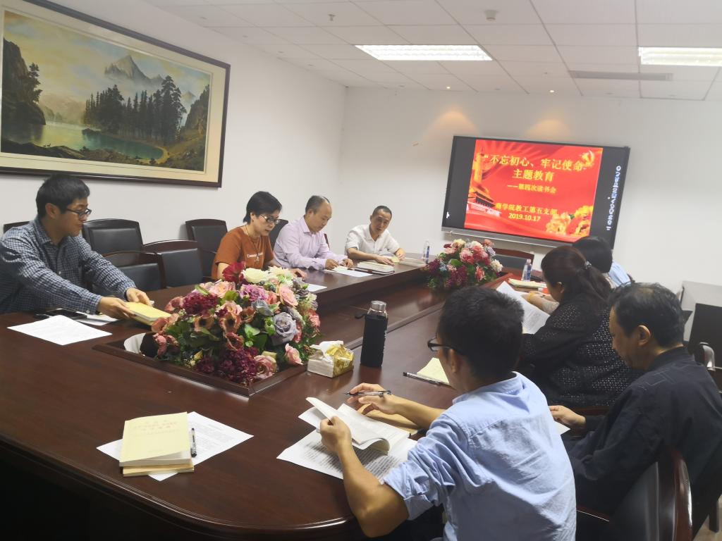 为深入学习“不忘初心、牢记使命”主题教育,认真贯彻中央主题教育精神,商学院教工第五党支部于10月17日下午在学院A222会议室召开第四次初心读书会。