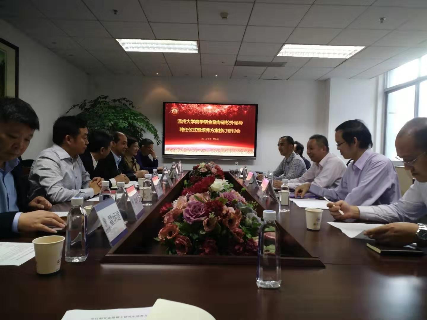 聘任仪式结束后,与会校外导师与学院的师生进行了深入的交流,并就金融专硕培养方案的修订,从研究方向设置、课程设置、教学方法、师生交流等方面提出了许多意见和建议,并表示定当履行好校外导师的职责,争取为温州大学商学院的人才培养创造条件。