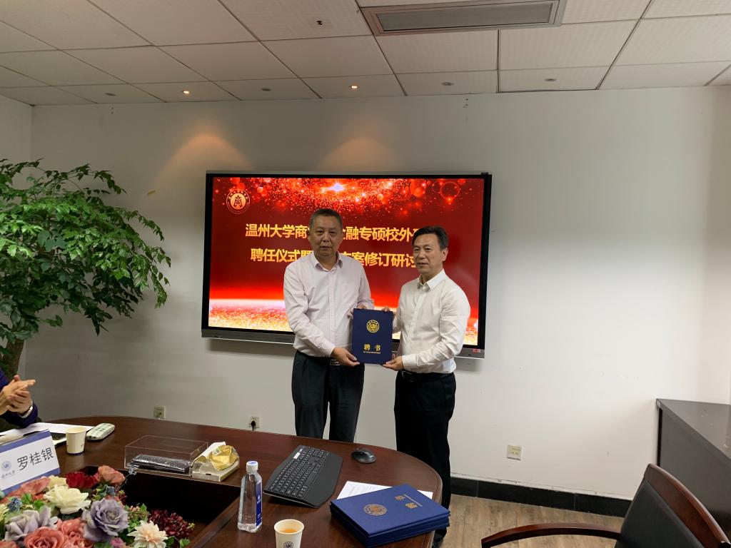 在宣读了学院的聘任文件后,院长胡振华分别为温州市人民政府副秘书长章炜、龙湾农村合作银行总行行长刘少云、温州市招商银行副行长刘宗华、中国建设银行温州分行见习副行长夏诒恒、温州欣荣税务师事务所有限公司董事长罗桂银、浙江伟明环保股份有限公司董事长项光明、申万宏源证券温州分公司总经理瞿炳建、叁陆伍资本董事长王仲辉等8位校外硕士研究生导师颁发聘书。