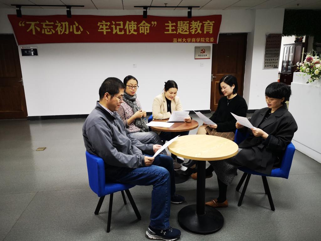 2019年11月21日,商学院教工第六党支部全体党员展开“不忘初心、牢记使命”主题教育学习会。