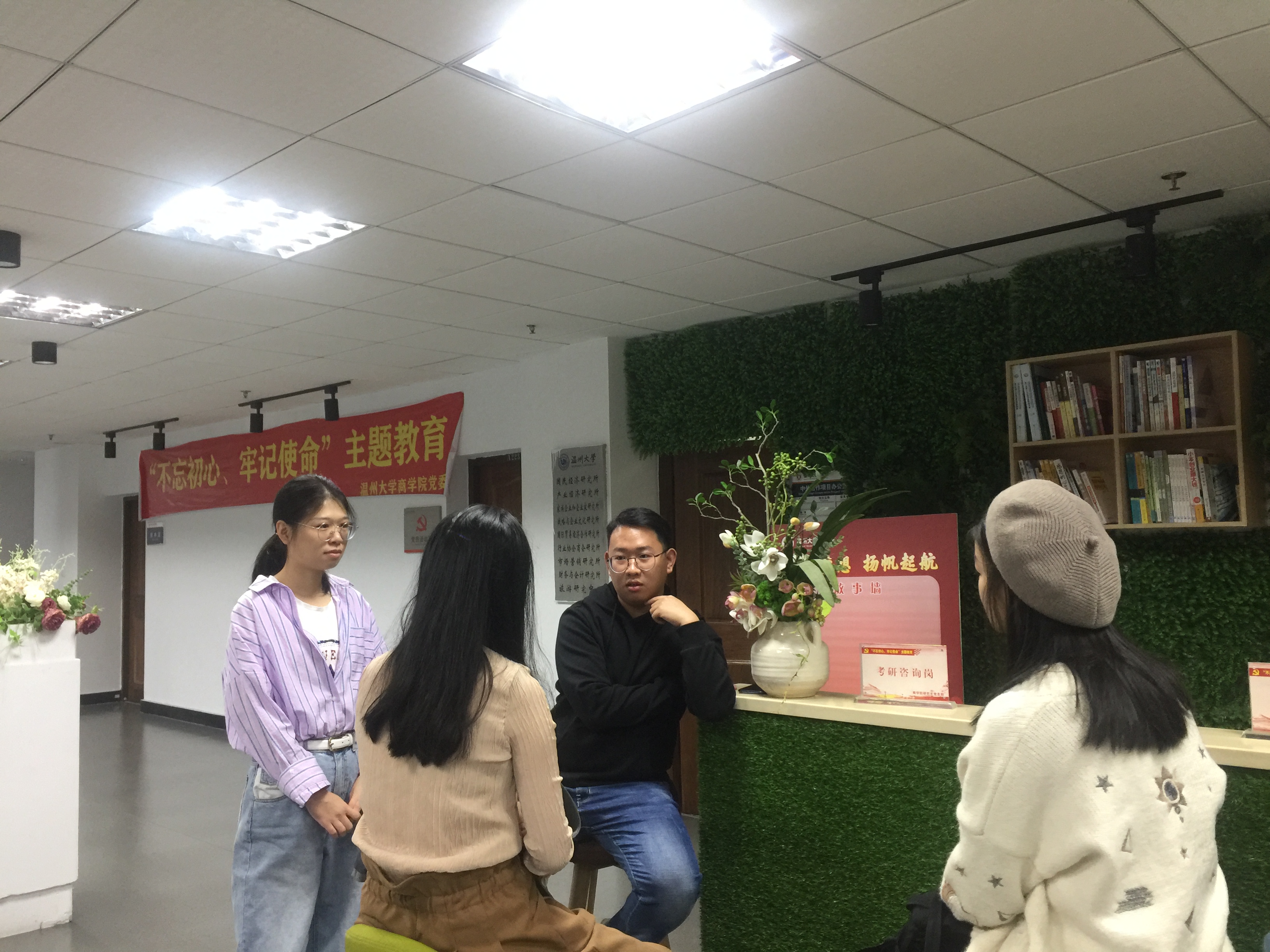 考研对于同学们来说是一种自我提升、自我升华的选择,了解考研科目、资料获取并制定考研规划能够有助于同学们更高效地进入考研的状态。负责考研咨询岗的研一学生夏禹细致地解答了前来咨询的两位大二学生的疑问:“考研要复习多长时间呢?各门课复习该如何安排时间?”此外,夏禹学长还就跨考问题给出了自己的建议,他提醒两位学妹要搞清楚自己考研的目的是什么,是因为对学术感兴趣而想继续攻读学位,还是想要获得更好的职业,亦或是圆自己的名校梦,不同的目的可能所做的选择也有所不同。