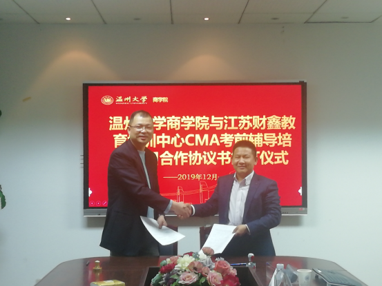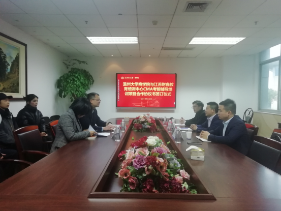 与财鑫教育(江苏财鑫教育培训中心)于商学院A222会议室举行了CMA等培训项目签约仪式。副院长余向前,财务管理系教师张烨,财鑫董事长张福德、财鑫浙江渠道总监桑智明、财鑫行政部部长黄健等出席此次签约仪式。