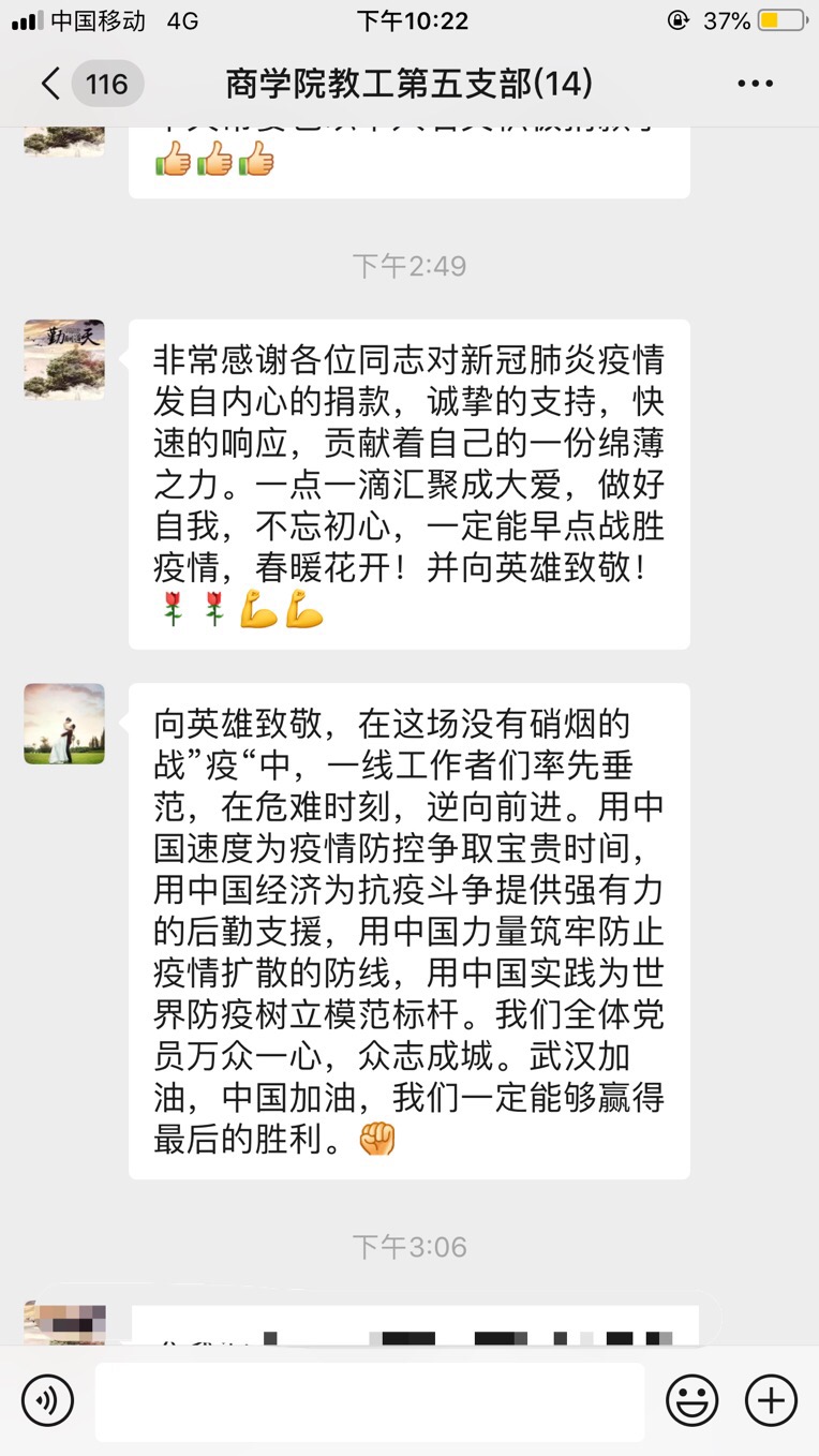 新型冠状病毒肺炎疫情的发展形势,始终牵动着学院老师的心,市场营销支部的陈飞宇等不少党员老师此前已通过其他途径踊跃参与捐款捐物,听说本次活动后,二话不说再度慷慨献爱心。教工第五支部的党员老师们在捐款后还纷纷留言支持抗疫英雄,支部书记黄兴利老师很是感动,他说道:非常感谢各位同志对新冠肺炎疫情发自内心的捐款,诚挚的支持,快速的响应,贡献着自己的一份绵薄之力。一点一滴汇聚成大爱,做好自我,不忘初心,一定能早点战胜疫情,春暖花开!并向英雄致敬!各位党员老师纷纷表达了对战胜疫情的坚定信念。