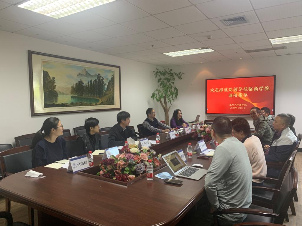 黄文浩处长对学院在疫情期间的招生宣传和就业工作表示肯定,认为学院招生宣传工作开展早,就业签约情况底数清,工作开展扎实稳定。同时,他向学院反馈学院专业招生一段线数据、以及往届毕业生调查相关数据,并强调下一阶段要做好毕业生留温工程和毕业生跟踪调查工作,提高调查满意率。他鼓励学院全员、全方位、全过程抓好就业工作,确保今年毕业生稳就业,把就业纳入招生、人才培养体系,多措并举提高学生就业能力,打造商科学生高质量就业品牌。