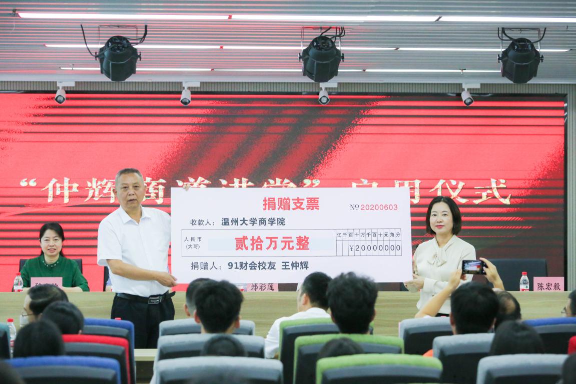 91财会校友王仲辉先生在疫情严重影响经济的情况下,慷慨解囊,为学院的校友文化贡献智慧,出资20万元支持学院的文化建设,并接受学院真诚的邀请,为会议室冠名。校党委副书记庄兴忠、商学院院长胡振华、商学院党委书记郑彩莲、后勤处处长屠霁霞共同为“商道讲堂”揭牌,胡振华院长代表学院接受王仲辉校友的捐赠。