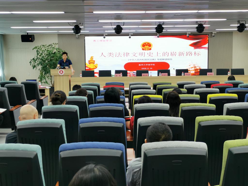第四项议程,全院教职工集中理论学习《民法典》。在郑彩莲书记的带领下,从《民法典》的立法经过、立法意义、总体要求和基本原则、主要内容、学习贯彻等五方面进行了学习,郑书记指出全体老师要全面贯彻学习民法典,学习它,遵守它,维护它,最关键的是要运用它,讲好中国特色社会主义制度优势性的故事,深刻理解在推进全面依法治国、国家治理体系和治理能力现代化进程中的作用、深刻领会以人民为中心的重要意义。