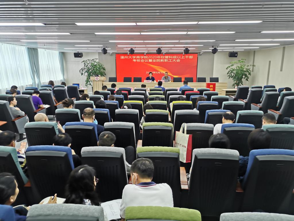 6月10日下午,温州大学商学院首次在新落成的A226仲辉商道讲堂举行全院教工大会——2020年校管科级以上干部述职考核会议暨全院教职工大会,与会教职工在还披着大红绸花的“仲辉商道讲堂”牌匾下有说有笑地签到、互相问候,会前在期待许久的新讲堂里或小聚或合影,充满了盈盈笑语,仿佛久别重逢的家人再次聚首。