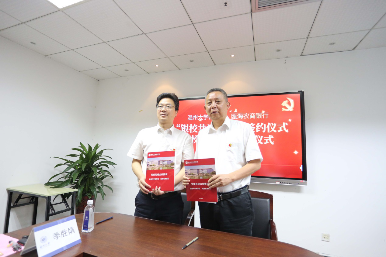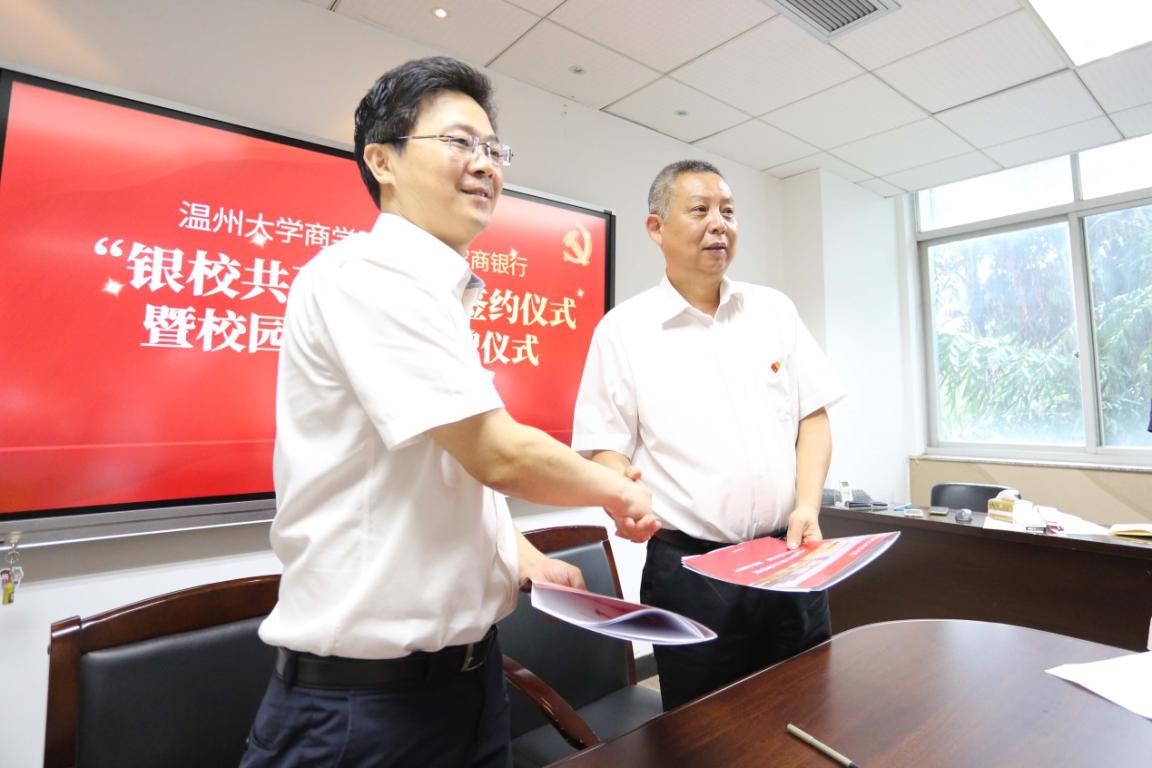 7月1日上午,瓯海农商银行党委书记、董事长黄定表,副行长李成武一行人来到温州大学商学院参加“银校共建”合作签约仪式,温州大学党委副书记庄兴忠,温州大学商学院院长胡振华等领导出席仪式。