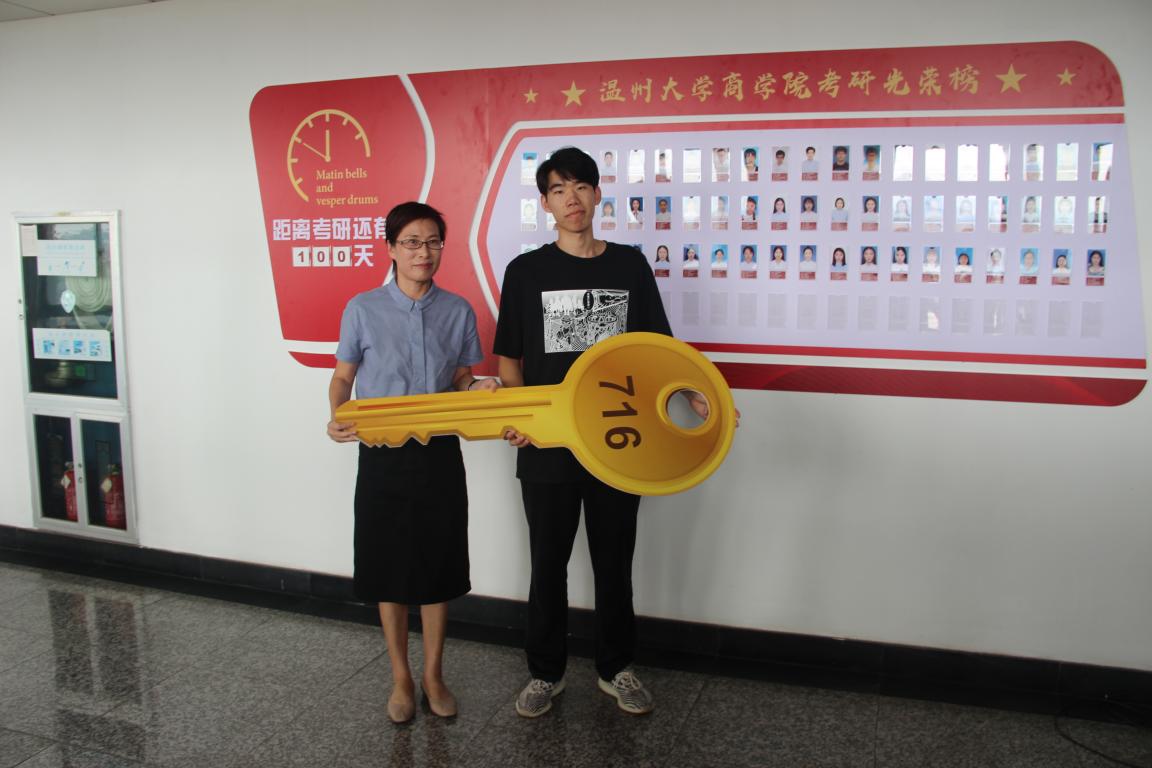 仪式上郑彩莲书记将自习室钥匙正式递交给学生负责人。接过钥匙的是17级的沈伟涛同学,他是学院365奖学金的获得者之一,在学院组织的暑假考研学习营打卡活动中,沈同学每天都是最早到达自习室的人,新自习室投入使用后他也主动提出要继续担任负责人,为研友们做好服务。随后,学院还为在暑期学习营打满所有卡的8位同学送上了丰厚的学习大礼包,他们也获得了第一批入驻自习室的资格。
