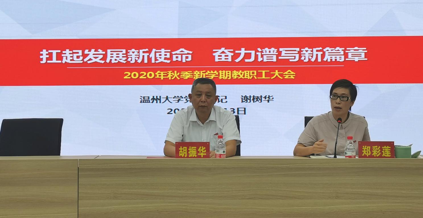 首先,学习校党委书记谢树华9月13日上午温州大学新学年教职工大会上以《扛起发展新使命,奋力谱写新篇章》为主题的讲话精神。谢书记在讲话中特别强调,一定要牢记习近平总书记对温州大学的殷殷嘱托:“要高度重视教育和人才工作,特别要办好温州大学等高等院校。”谢书记精准凝炼了学校在上半年所取得的16大成绩,对未来的四大展望,尤其对师德进行了高度的概括:对事业忠诚、对学生热爱、对集体关心,对自己严格。